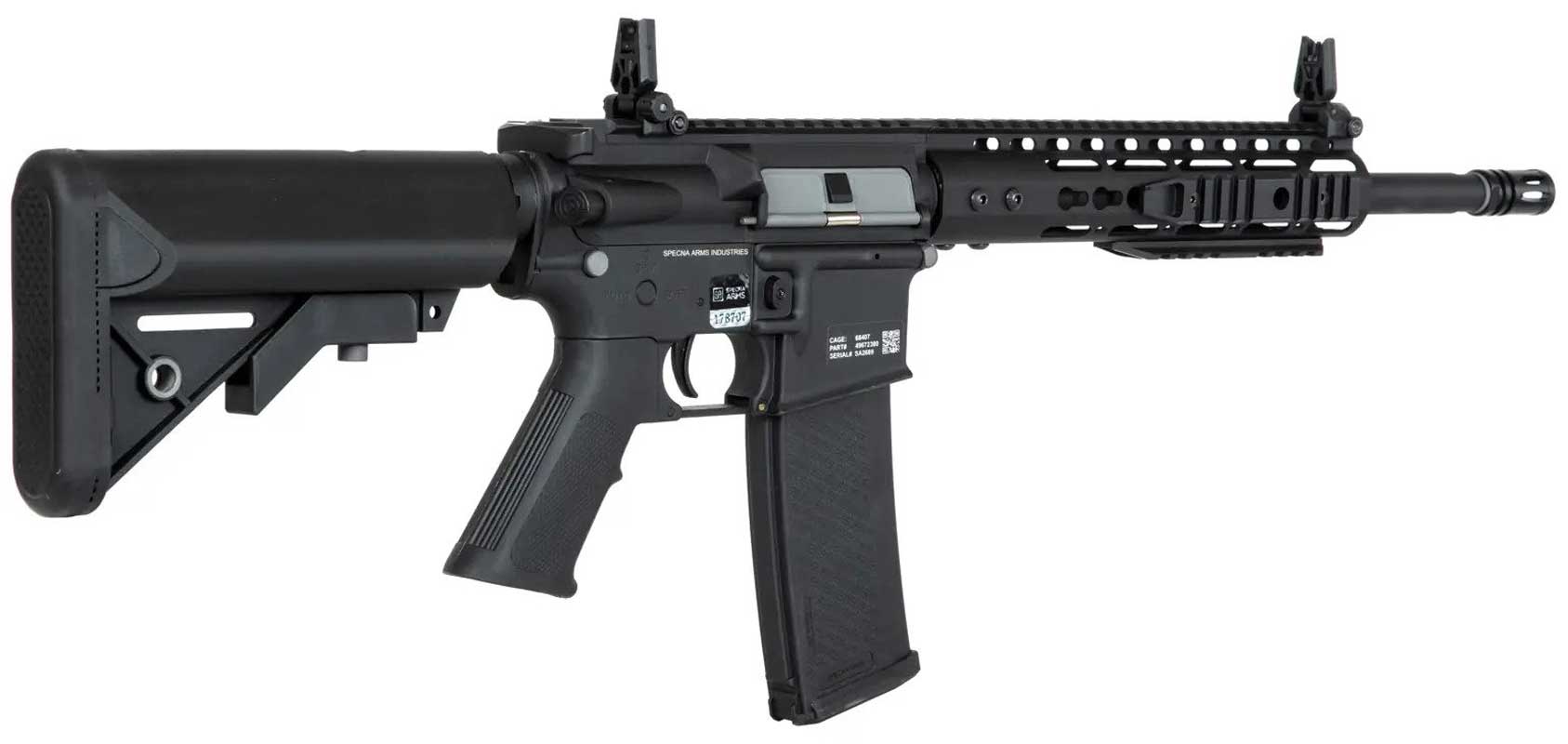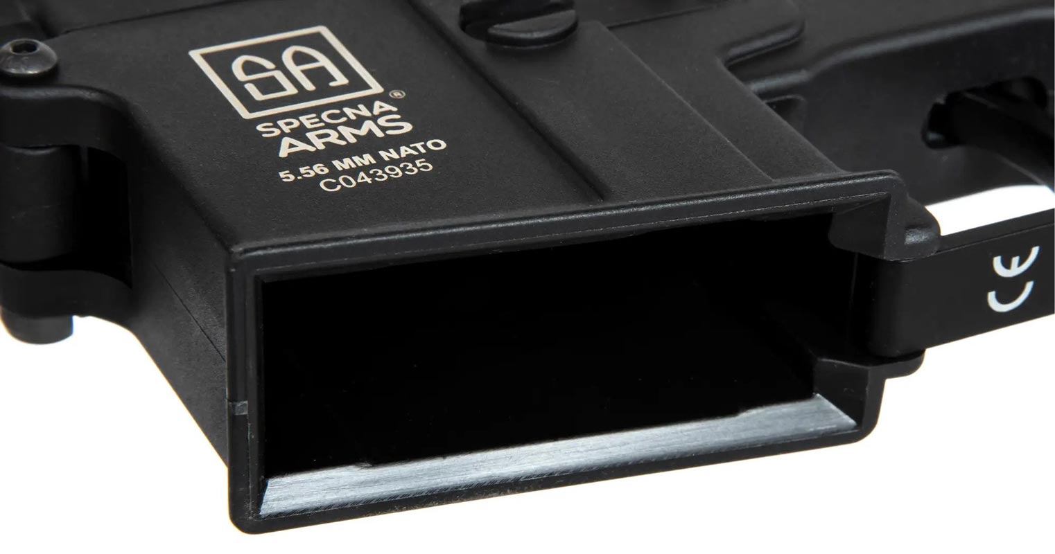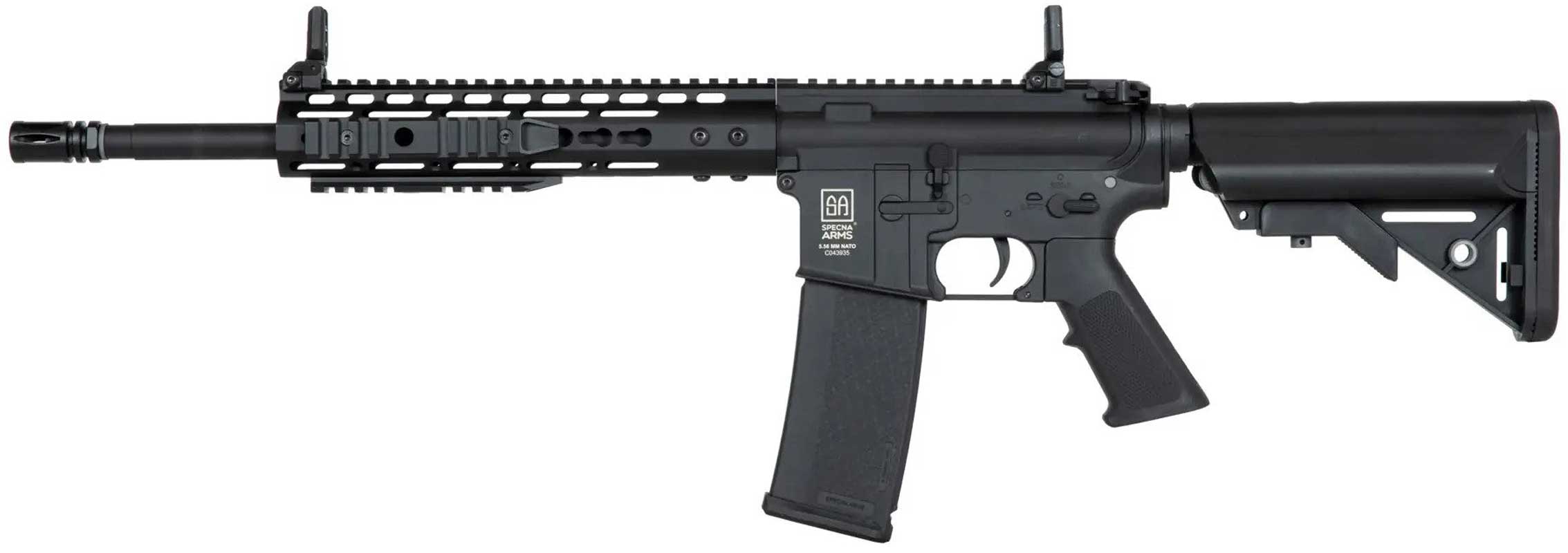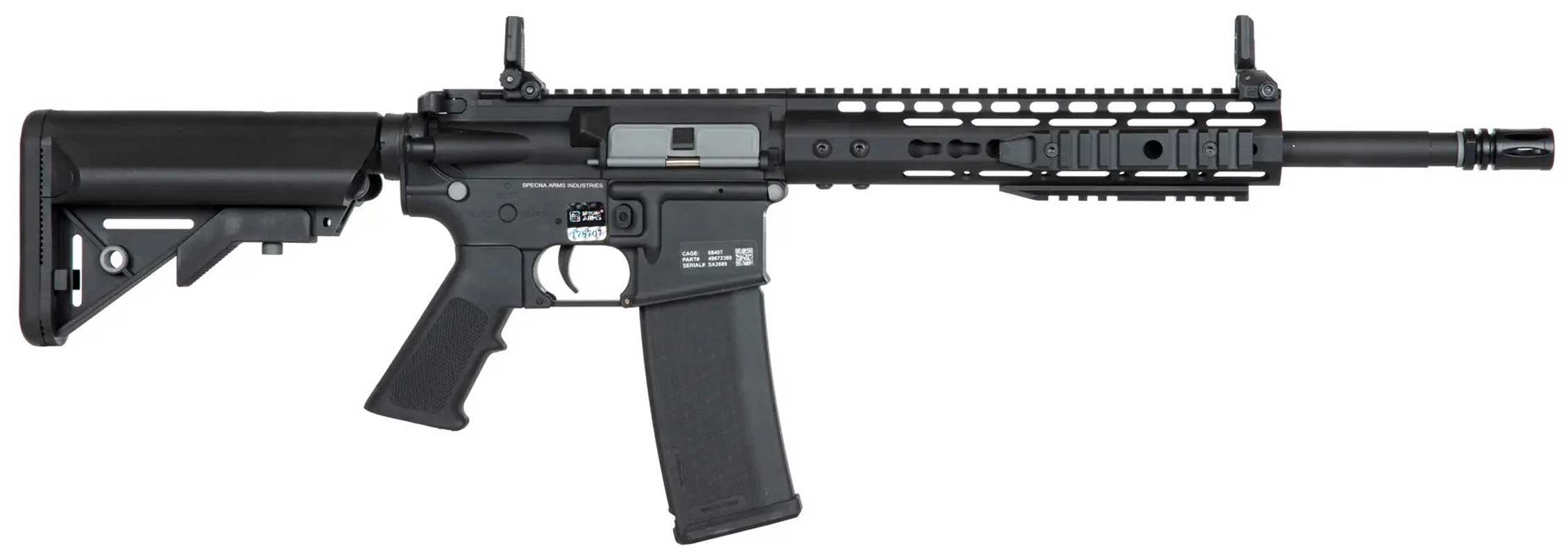 Specna Arms core Ca-C09 taktisk keymod HAL Mosfet edition Specna Arms core Ca-C09 taktisk keymod som kommer med metal keymod front. Specna Arms core Ca-C09 taktisk keymod geværet kommer med forstærket gearboks, gearhjul og ESA quick spring change system, der gør det muligt hurtigt at skifte fjeder. Geværet har med sin lange keymod front masser af muligheder for montering af div. udstyr og tilbehør. Reciver på geværet er fremstilet i nylon fiber, der giver ekstra styrke og en flot overflade. Godt gevær der skyder godt og stabilt med mange muligheder for opgradering. Geværet leveres med 8 mm bøninger i gearboksen øget styrke. Denne Core SA-C08 keymod dual tone kommer med programmerbar HAL mosfet som kommer med en lang række af funktioner, der lader dig konfigurere din riffel næsten som du ønsker det. HAL mosfet er let at programmere via aftrækkeren så intet ekstra udstyr kræves, og alle indstillinger kan let omstilles. Data.: * Skyder 115 m/s ( målt med 0,20g kugler ) * Magasinet kan holde på 300 kugler. * Længden er 71 / 79 cm. ( kolben foldet ind / ud ) * Løbet måler 38 cm. * Vægten er 2,34 kg. * Hop up er justerbar * Fremstillet i ABS fiber med metal front. * Keymod rail * Forstærket gear og gearboks. * ESA quick spring change. * HAL programmerbar mosfet installeret. * Leveres i sort farve. * Sigter der kan lægges ned. * Kolben kan justeres i længden. * Produceret af Specna Arms. Pakken indeholder.: * CA-C09 riffel. * 300 skuds S-mag magasin * Manual over geværet. * ekstra M90 fjeder. Dette gevær leveres uden batteri og lader. Vi anbefaler vores 11,1v LiPo batteri pakke med 1100 mAh for optimal ydelse. Vi anbefaler 0,20g kugler til denne model. Husk at købe Bio Kugler for et grønnere milijø.