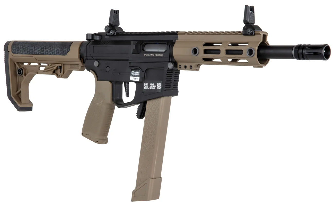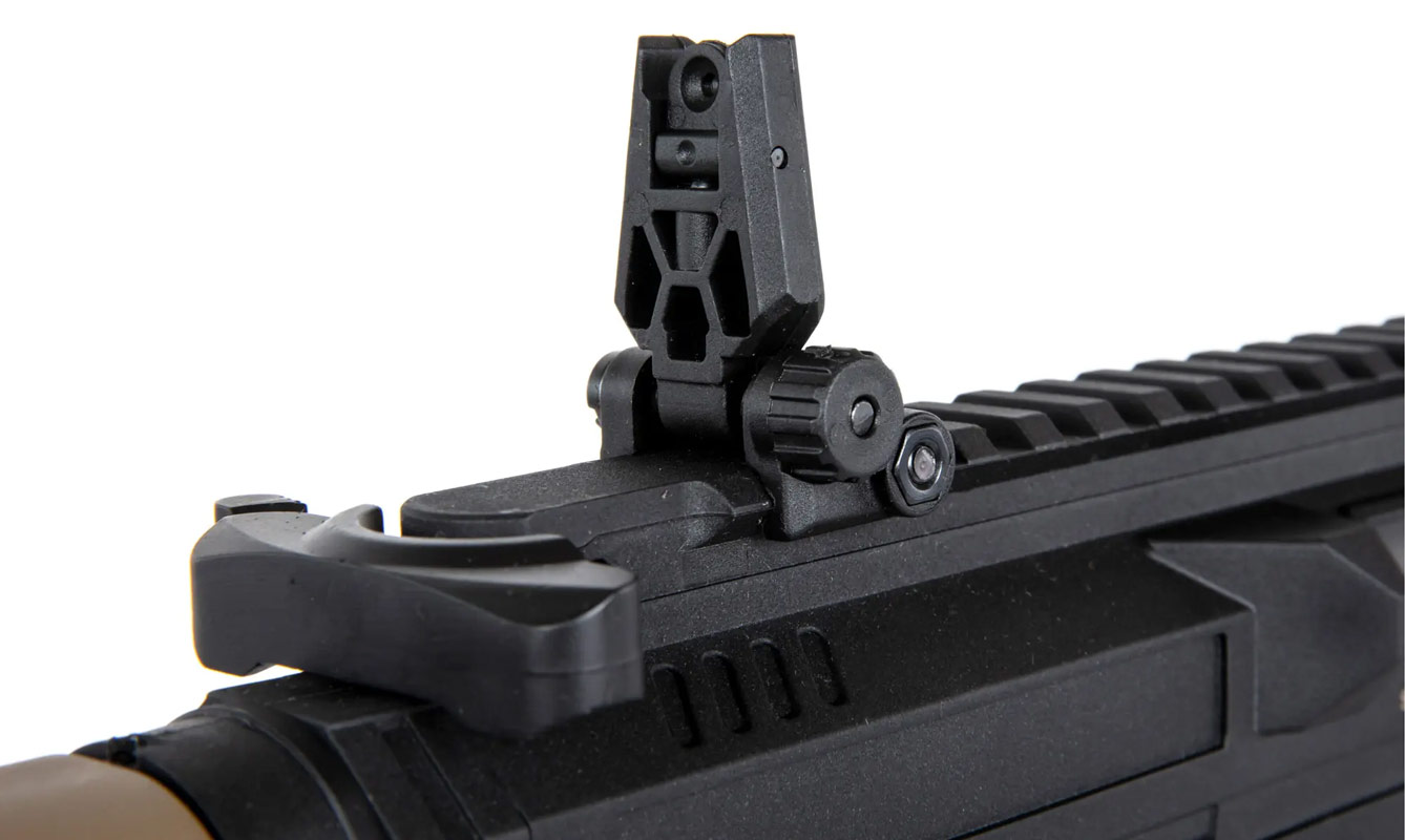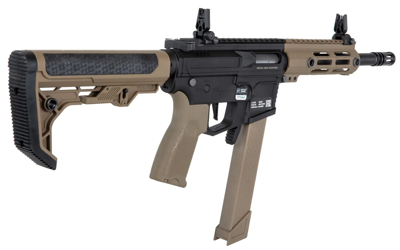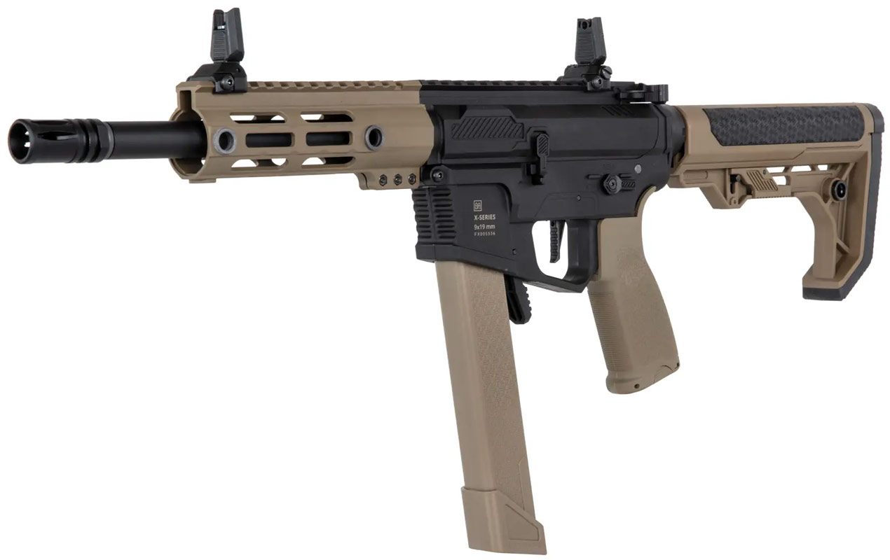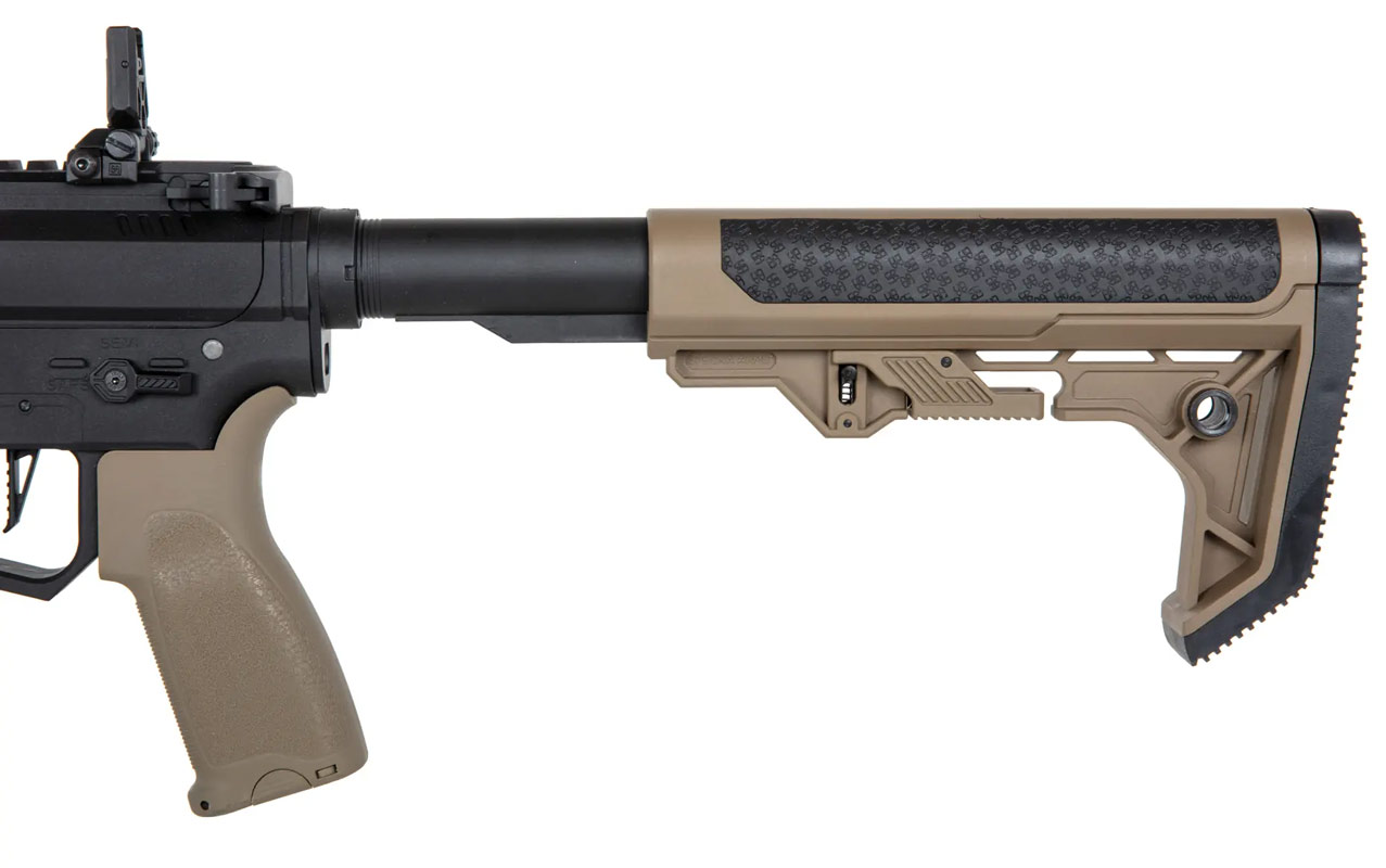SA-FX01 M-lock dual tone som kommer med M-lock rail. SA-FX01 keymod er et kort våben som kommer lang rækkevidde da modellen er monteret med 6,03 præcisionsløb. Gearboksen på SA-FX01 M-lock modellen er forstærket, med 8 mm kugle lejer monteret samt mulighed for hurtig skift af fjeder. SA-FX01 kommer med HAL Mosfet som er programmerbar, samt en speed aftrækker som sikre et lynhurtigt aftræk. Geværet er fremstillet i nylon fiber med metaldele, dette er med til at sikre en lav vægt på kun 1,9 kg. uden at gå på kompromis med kvaliteten på de ydre dele.