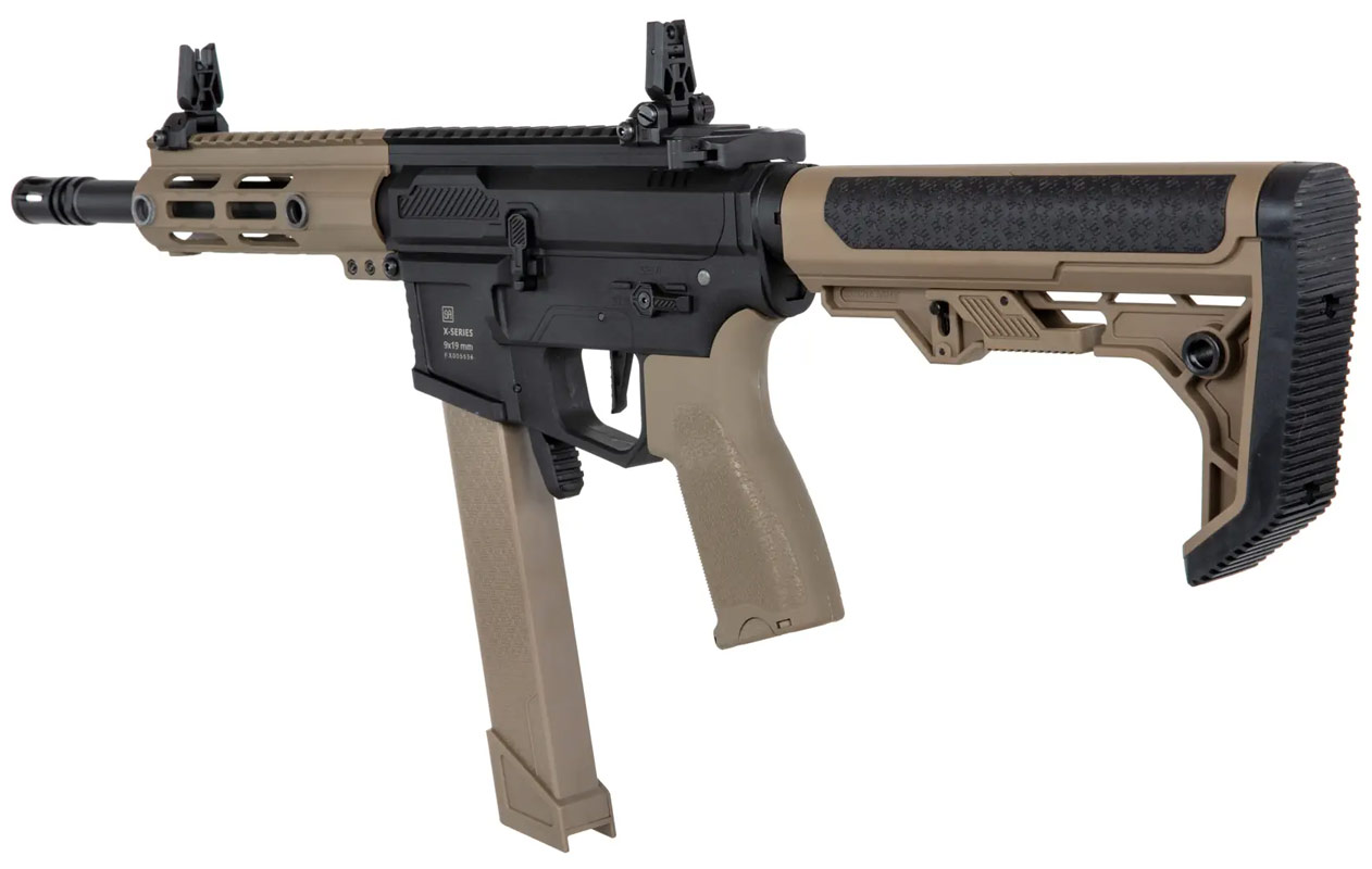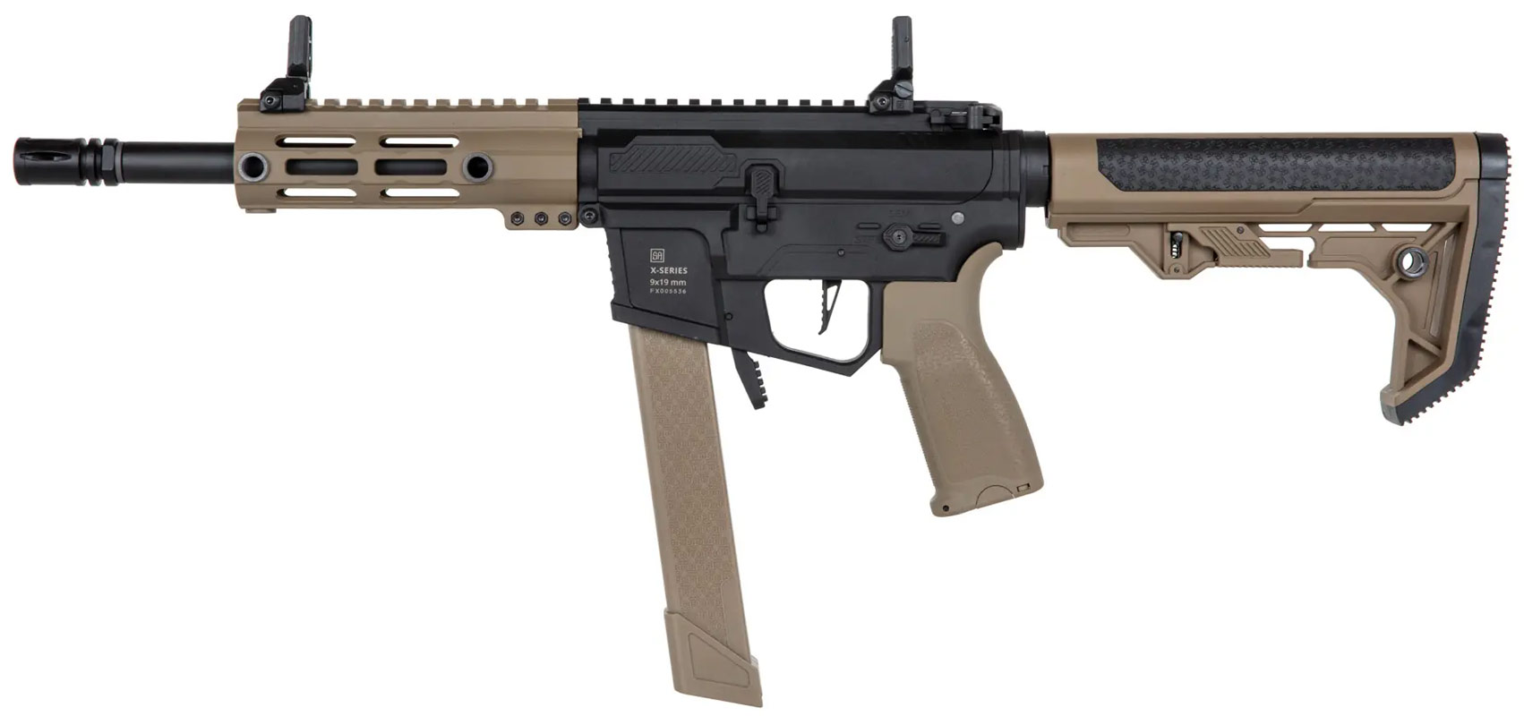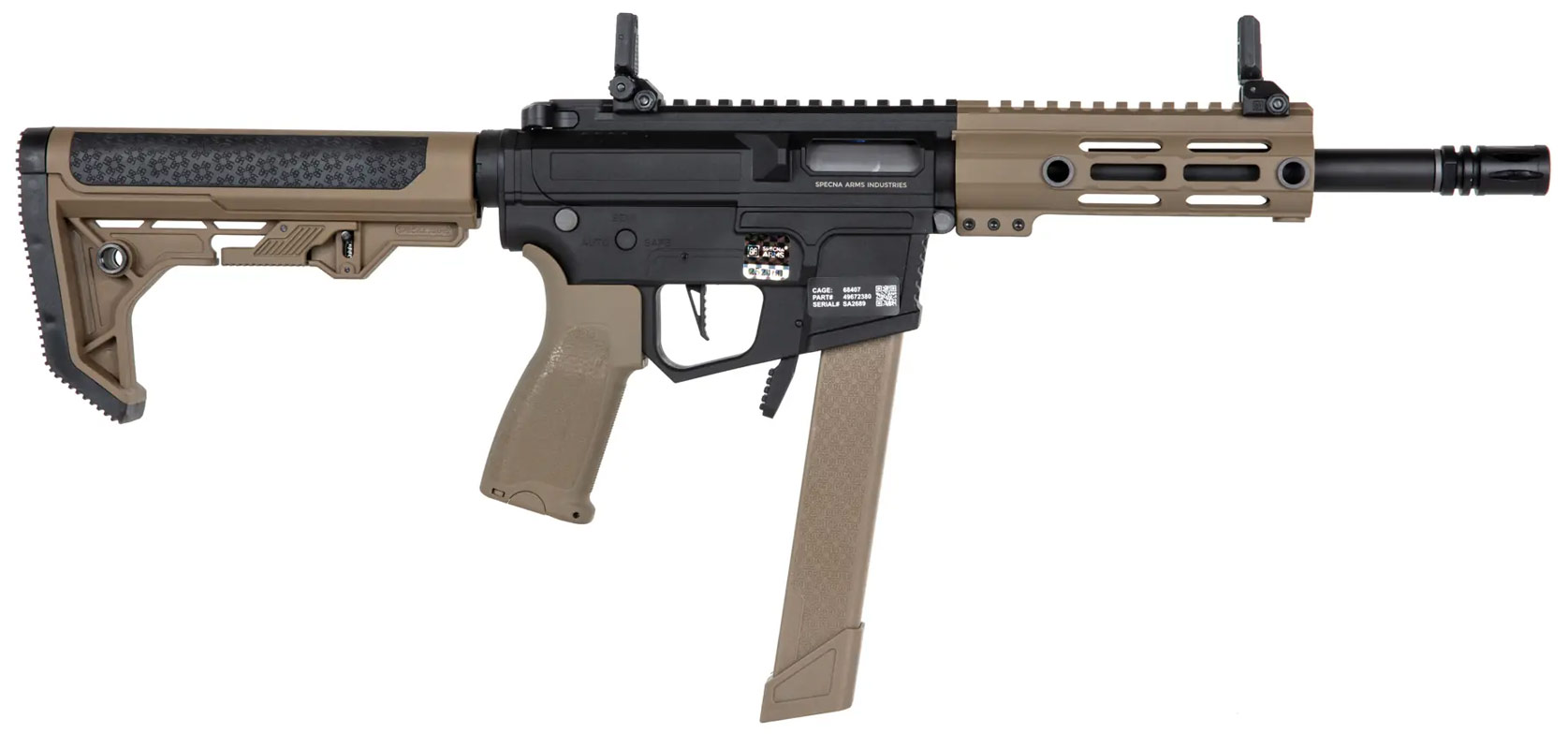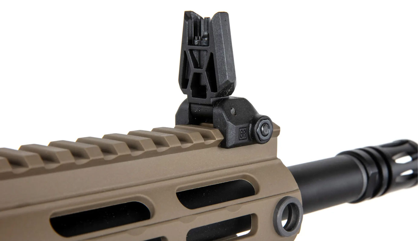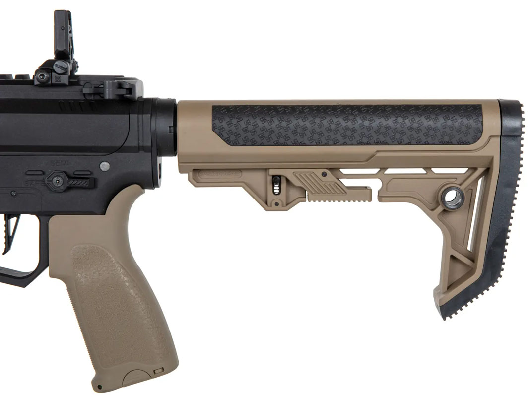 SA-FX01 M-lock dual tone som kommer med M-lock rail. SA-FX01 keymod er et kort våben som kommer lang rækkevidde da modellen er monteret med 6,03 præcisionsløb. Gearboksen på SA-FX01 M-lock modellen er forstærket, med 8 mm kugle lejer monteret samt mulighed for hurtig skift af fjeder. SA-FX01 kommer med HAL Mosfet som er programmerbar, samt en speed aftrækker som sikre et lynhurtigt aftræk. Geværet er fremstillet i nylon fiber med metaldele, dette er med til at sikre en lav vægt på kun 1,9 kg. uden at gå på kompromis med kvaliteten på de ydre dele.