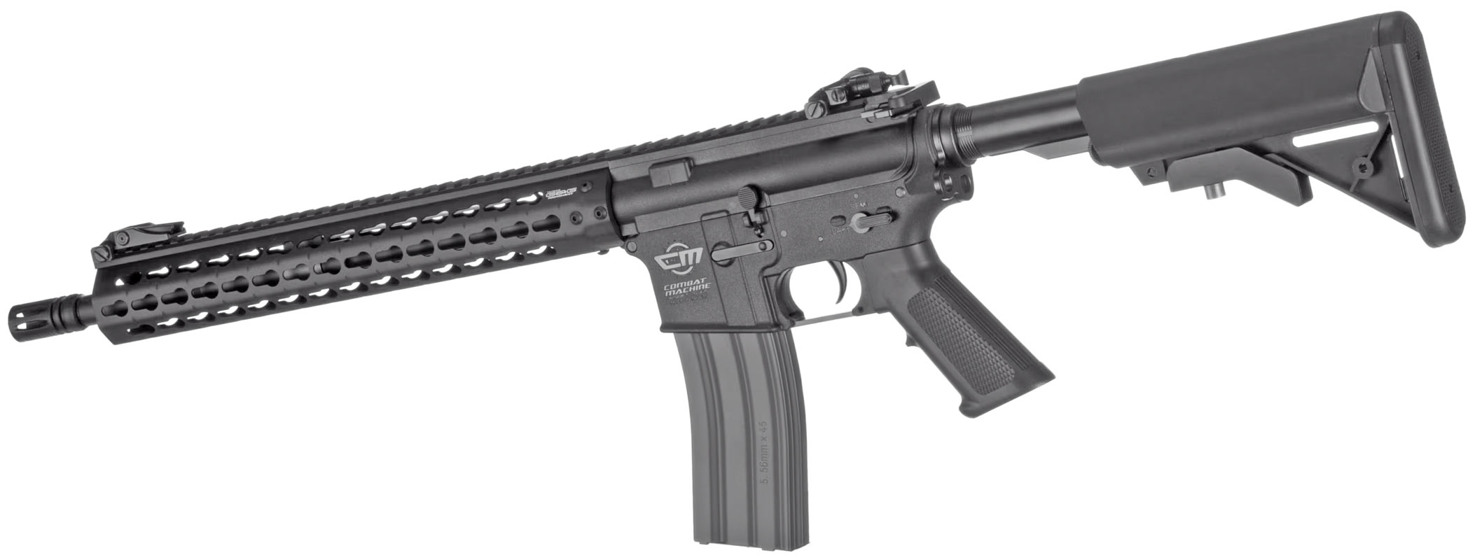 G&G Combat Machine 13" keymod riffel. En model der er fremstillet i kraftigt ABS plast og har keymod rail til montering af udstyr. G&G CM15 13" keymod har kolbe der kan foldes ud / ind, samt sigter der let kan foldes ned. En god og stabil riffel fra G&G som har en god og lang kuglebane.