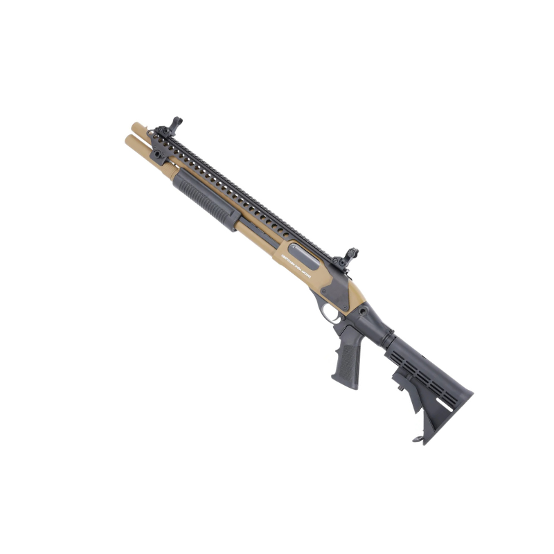 er en solid, gasdrevet pump-shotgun designet til tætte, taktiske runder. Den kombinerer metalbygning med taktiske løsninger som integreret shells-loader og Picatinny-rail, så du hurtigt kan genopfylde og montere optik eller tilbehør i feltet. Perfekt til spillere, der vil have et robust, funktionelt våben til CQB.