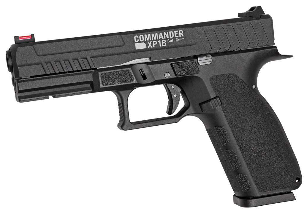 Commander XP18 Co2 pistol der kommer med metal slæde og fiber ramme som har rail monteret under løbet til div. udstyr. Pistolen har ventileret slæde og fiber optisk front sigte. Pistol grebet er udformet så det giver skytten optimalt greb om pistolen. Aftrækkeren har indbygget sikkerhed. En God pistol med kraftigte Blow Back Data.: * Skyder 96 m/s ( målt med 0,20g kugler ) * Magasinet kan holde på 24 kugler * Længden er 20 cm. * Løbet måler 9,6 cm. * Vægten er 770g * Hop up er justerbar * Slæden er i metal og ventileret * Rammen er i fiber * Rail under løbet til montering af udstyr * Front sigtet er med fiber optik * Co2 er placeret i magasinet * Producenten er ASG Pakken indeholder.: * Commander XP18 pistol * Magasin til pistolen * Lille pose med kugler * Værktøj til skift af co2 * Manual over pistolen
