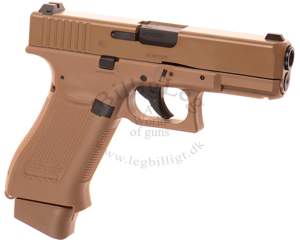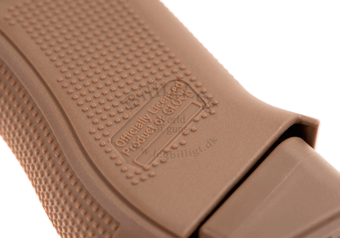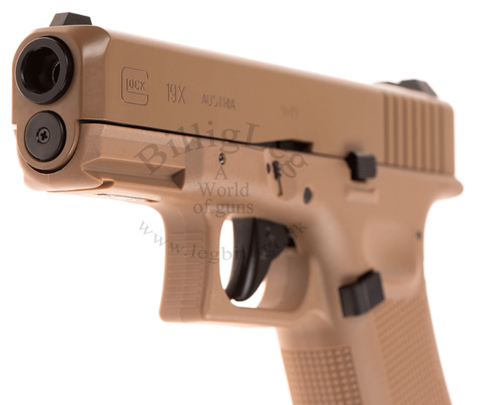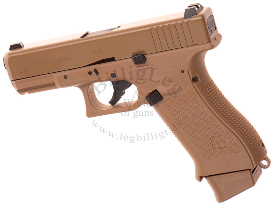 Glock 19X Co2 Blow Back Glock 19X Co2 pistol som kommer med metal slæde og originale Glock markeringer. Glock 19X har et hurtigt og kraftigt Blow Back som giver en realistisk fornemmelse, når man skyder. Pistolen er designet helt efter den originale GLOCK så der er ikke sparet på detaljer. God Co2 Blow Back pistol der skyder godt. Data.: * Skyder ca. 130 m/s ( målt med 0,20g kugler ) * Magasinet kan holde på 14 kugler. * Længden er 19 cm. * Løbet måler 8 cm. * Vægten er 660g * Hop up er fast. * Slæden er i metal. * Rammen er i polymer fiber. * Farven er Tan * Originale Glock markeringer. * Producenten er umarex. Pakken indeholder.: * Glock 19X pistol * Magasin til pistolen * Manual over pistolen Vi anbefaler 0,25g kugler til denne model. Husk at købe Bio kugler for et grønnere milijø. Husk at købe Co2 patroner til denne model.