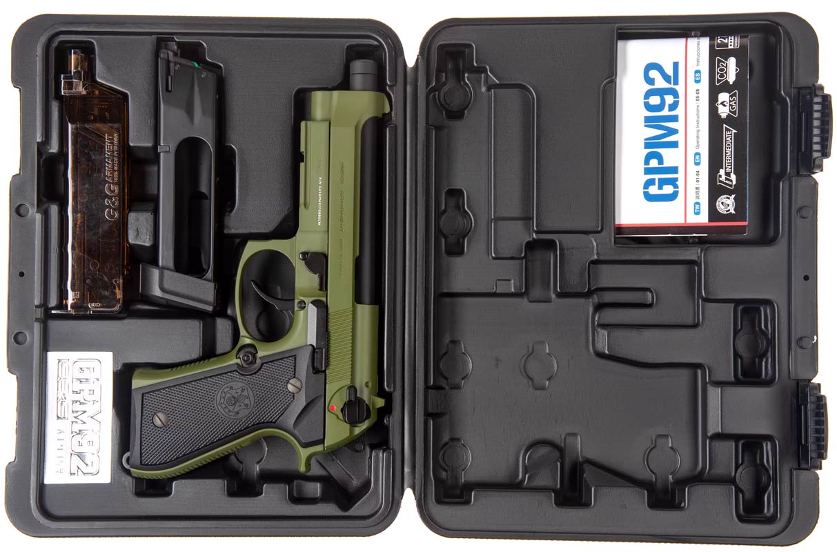 M9 Co2 pistol fra G&G som er fremstillet helt i metal og leveres med pistol kuffert. G&G M9 Co2 Blow Back modellen er i en flot hunter green farve og kommer med godt inderløb der sikre en lang og stabil kuglebane, og pistolen har realistisk vægt og design samt plads til hele 27 kugler i magasinet. G&G M9 Co2 pistolen har et godt og kraftigt blow back og ligger godt i hånden.