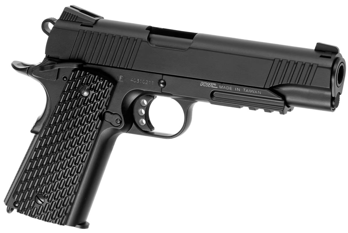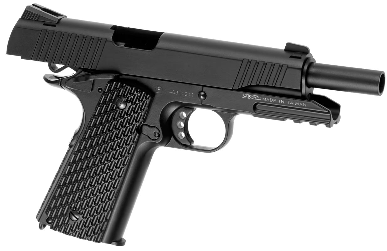 Full metal model af den kendte M1911 model. Denne model er fremstillet helt i metal og har plads til hele 14 kugler i magasinet. Under løbet er der monteret rail, som passer med alt 22 mm udstyr. En god Co2 pistol der er helt tro mod den originale model. Data.: * Skyder ca. 110 m/s ( målt med 0,20g kugler ) * Magasinet kan holde på 14 kugler. * Længden er 22 cm. * Løbet måler 10,8 cm. * Vægten er 907g * Hop up er justerbar. * Materialet er metal med enkelte ABS plast dele. * Farven er sort * Produceret af KWC Pakken indeholder.: * M1911 Tactical pistol. * Magasin til pistolen. * Manual over pistolen. * Værktøj til skift af co2 patroner.