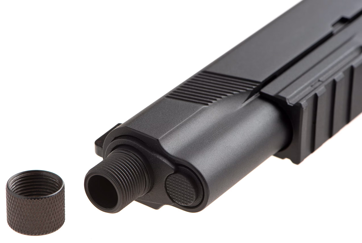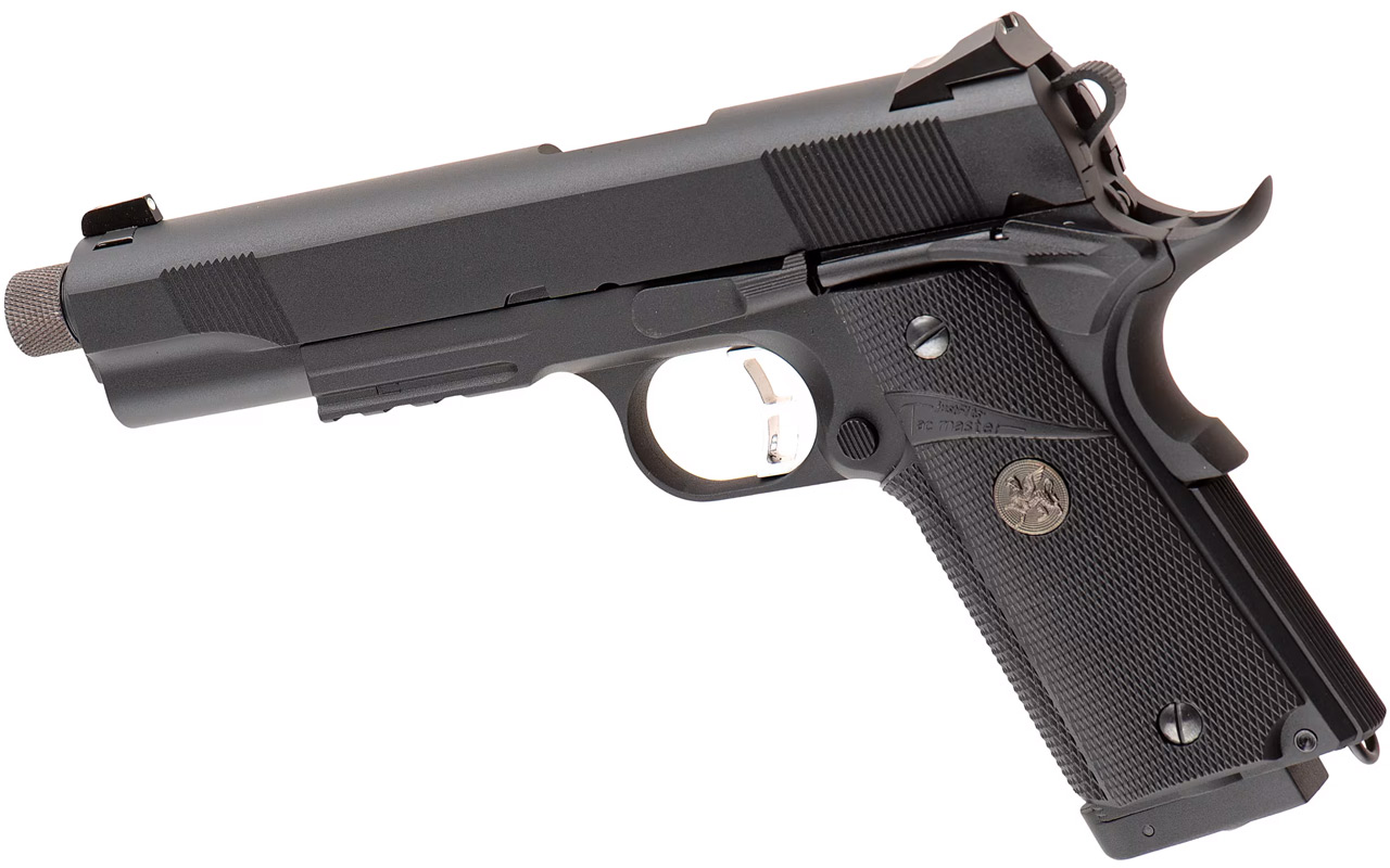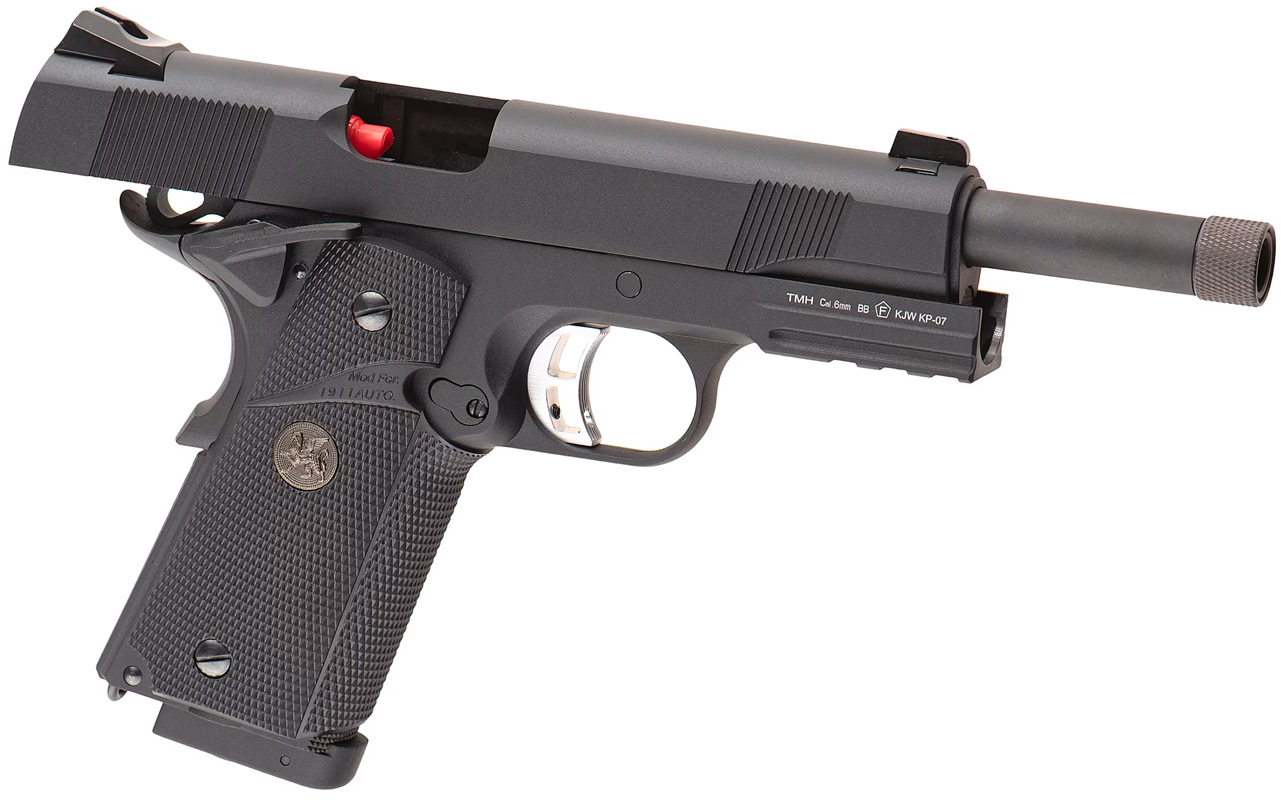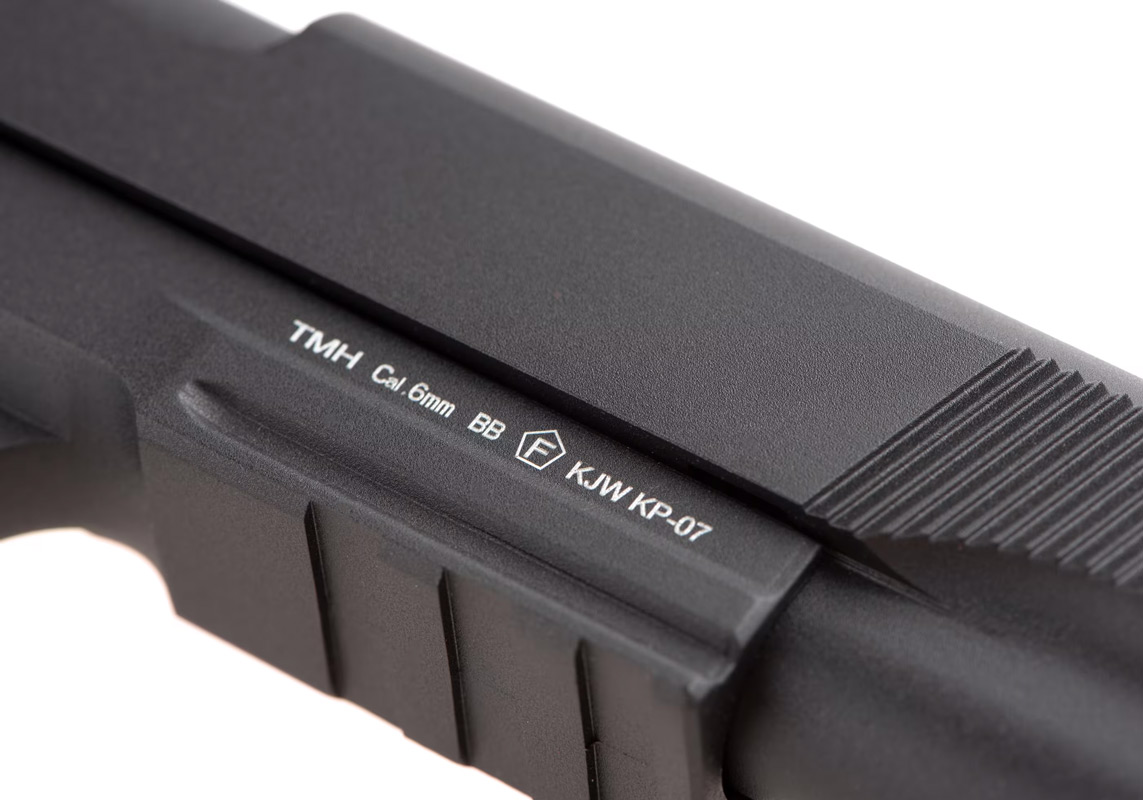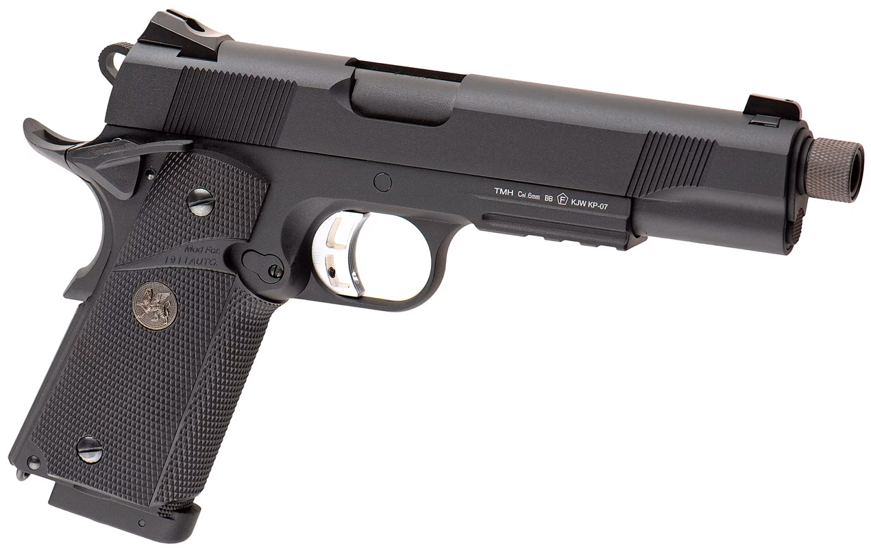 KJ M1911 MEU TBC black Full metal blowback En flot model af den klassiske M1911 model helt i sort og fuld metal med yderløb der er forberedt til lyddæmper med 14 mm CCW Gevind. Pistolen er fremstillet af KJ Works som er kendt for at lave airsoft modeller i høj kvalitet og med stor driftssikkerhed. Denne model af M1911 pistolen er ingen undtagelse, den kommer med behageligt pistolgreb, der sikre skytten har optimalt greb og stabilitet. Pistolen har et kraftigt blowback og tydelige markeret sigter for og bag. En god pistol fra KJ Works der har en god og stabil kuglebane. Data.: * Skyder 105 m/s ( målt med 0,20g kugler ) * Magasinet kan holde på 24 kugler. * Længden er 22,3 cm. * Løbet måler 11,3 cm. * Vægten er 980g * Hop up er justerbar. * Forberedt til lyddæmper. * Materialet er metal. * Farven er sort. * Produceret af KJ Works. Pakken indeholder.: * M1911 ETU TBC pistol i sort * Magasin til pistolen. * værktøj til skift at Co2 patron. * Manuel over pistolen.