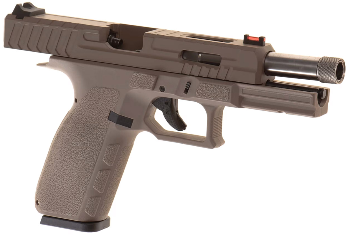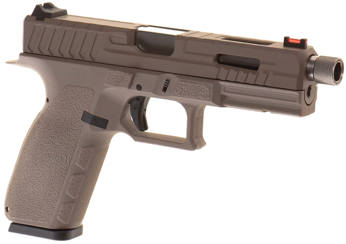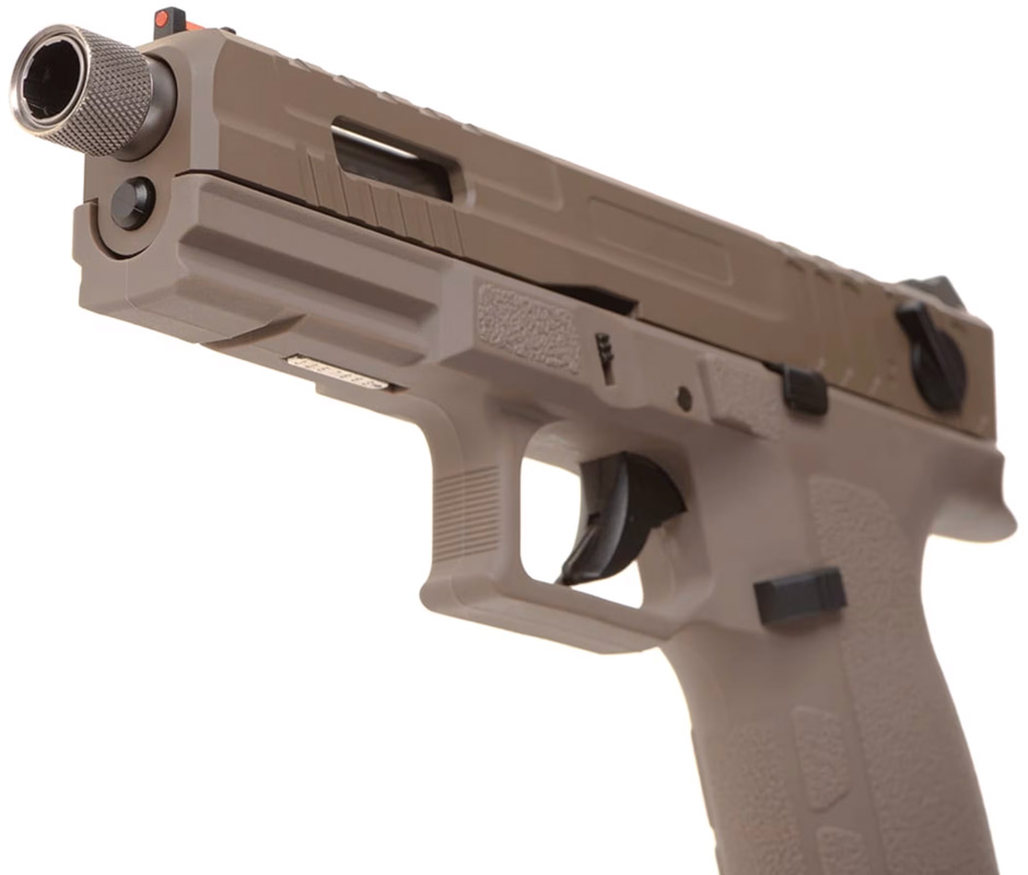 KP-13F TBC Full Auto pistol fra KJ Works i sandfarve. Pistolen er med metal slæde, med kig til yderløbet samt robust fiber ramme. Yderløbet er forberedt til lyddæmper med 14 mm CCW gevind, og fiber optiske sigter. KP-13F TBC pistolen kan køre semi eller full auto, hvilket gør den ekstra sjov. En god pistol der ligger godt i hånden, og skyder godt med lang stabil kuglebane.