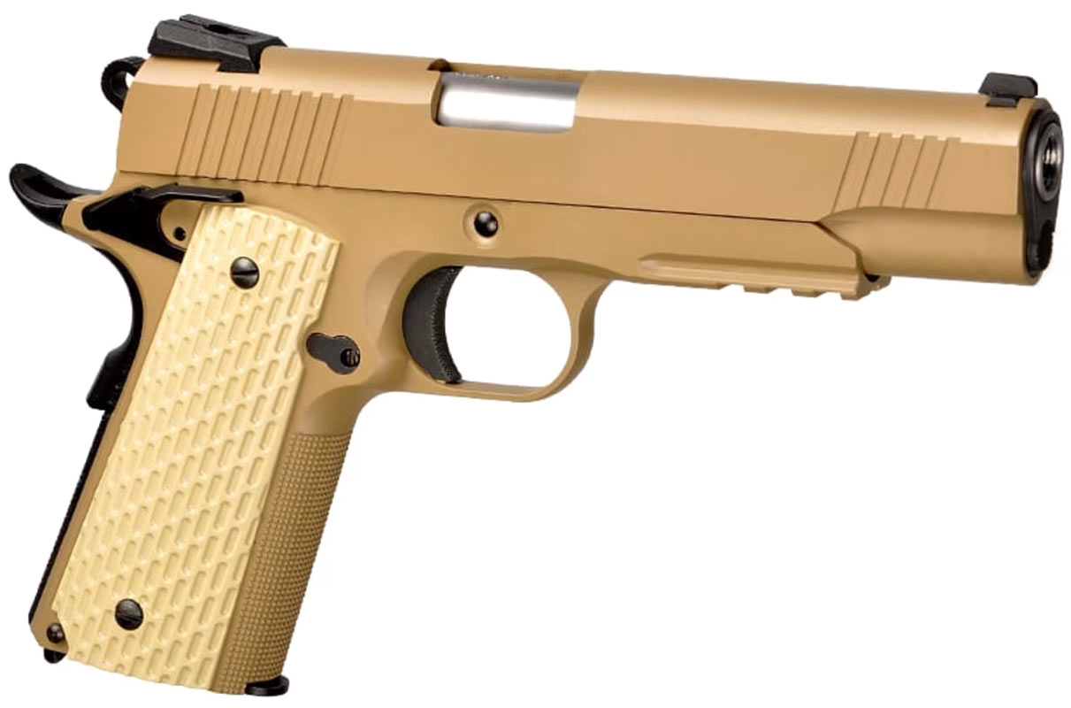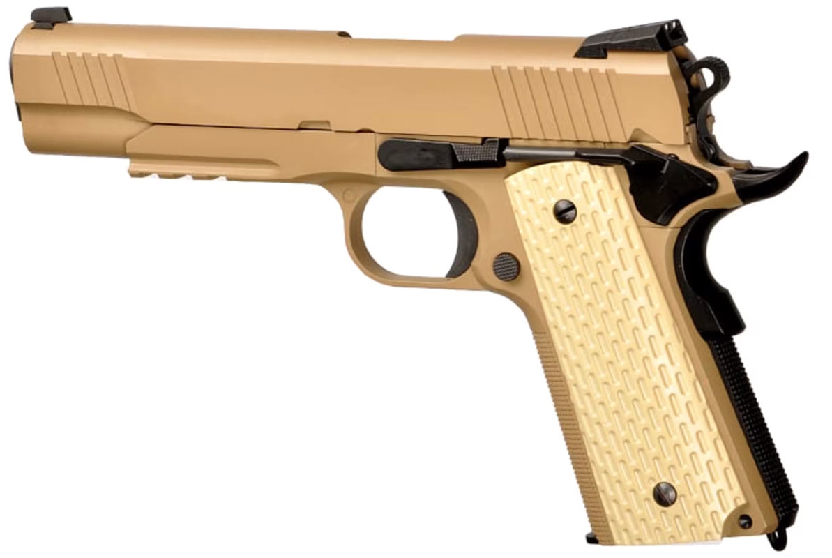 WE Desert warrior 5,1 full metal WE M1911 model som er fremstillet helt i metal i desert farve. WE Desert warrior 5,1 Pistolen fra WE kommer med gevind i yderløbet så der kan monteres en lyddæmper adaptor til lyddæmpere. Bag sigtet på pistolen er tydeligt markeret med hvide prikker som gør det lettere at sigte. WE Desert warrior 5,1 har rail under løbet til montering af forskelligt udstyr. Lækker pistol der kommer med flot finish i et klassisk design fra WE. Data.: * Skyder ca. 95 m/s ( målt med 0,20g kugler ) * Magasinet kan holde på 15 kugler. * Længden er 22,5 cm. * Løbet måler 11 cm. * Vægten er 945g * Hop up er justerbar. * Kraftigt Gas Blow Back. * Materialet er metal med enkelte plastdele. * Farven er desert. * Produceret af WE Pakken indeholder.: * WE Desert warrior 5,1 * Magasin til pistolen. * Manual over pistolen.