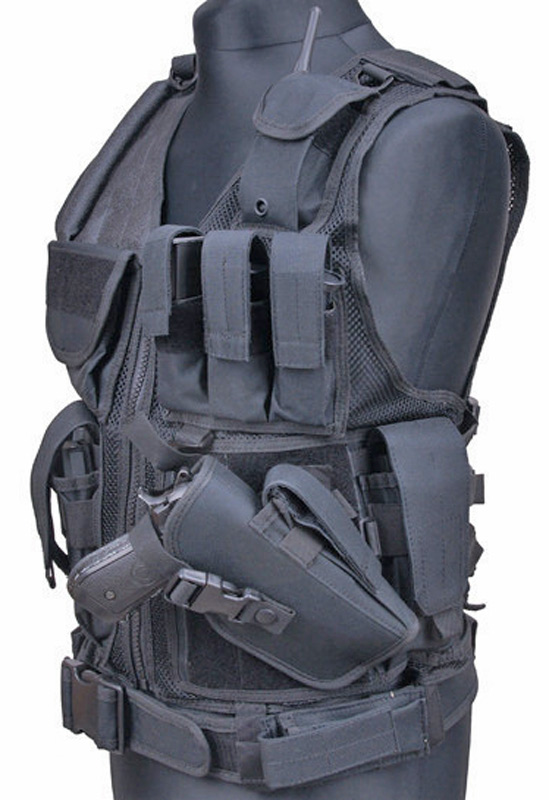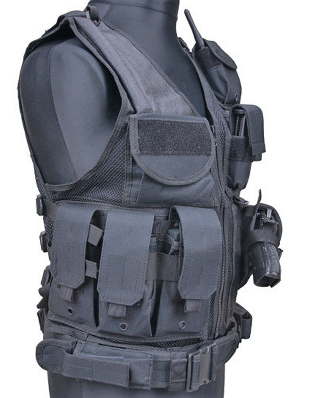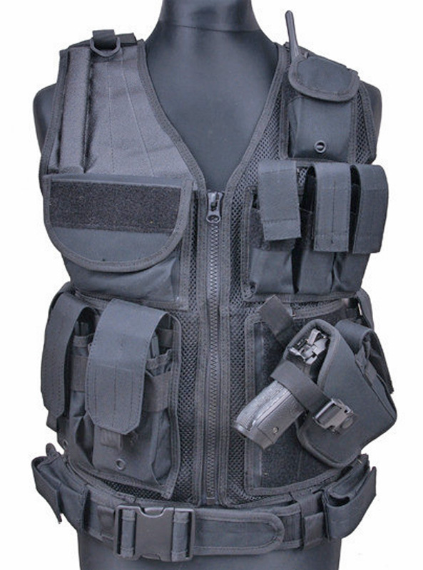Taktisk Kampvest i sort Taktisk kampvest som kommer med 3 magasin lommer i fronten. Vesten kommer med pistolhylster monteret på siden, dette kan tages af, og pladsen kan bruges til noget andet. Vensten har også plads til pistol magasiner og en masse andet. Vesten kan justeres så den passer til de fleste. Vesten leveres med kraftigt bælte og mulighed for montering af molle udstyr på ryggen. * Farven er sort * Fremstillet i kraftigt stof God Taktisk Kampvest som opfylder langt de flestes behov. Vesten har mange muligheder og er fremstillet i kraftigt stof. ( vensten leveres uden pistol og magasiner )