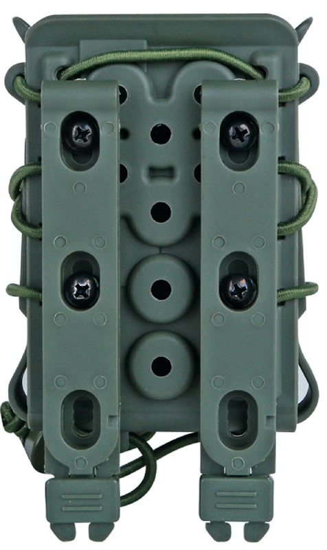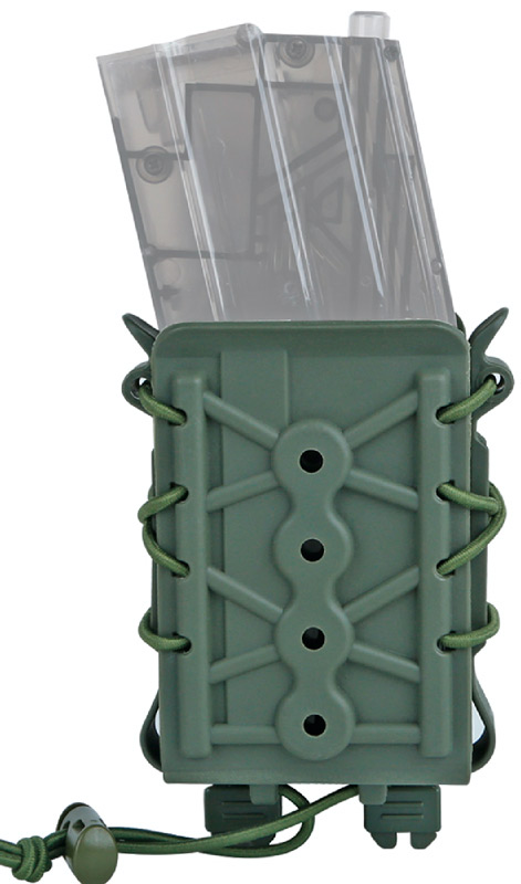 Magasinet strammes med elastiksnor så dem holder godt på langt de fleste magasiner. Siderne på lommen er i plast som låser på magasinet og åbningen er vinklet så det er nemmere at isætte magasinet.