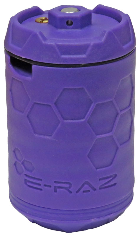 Eraz granat 2,0 - LillaAirsoft Eraz granat i lilla farve som har plads til ca. 100 kugler. Eraz granat 2,0 fyldes med gas og kastes, når den rammer målet kommer kugler ud i en radius af 2 - 3 meter omkring landings stedet. Eraz granaten har ingen løse dele andet end splitten der sikre granaten. Matrialet er kraftigt ABS polymer plast og metal dele. Granaten er let at bruge.* Farven er lilla* Højten er 9,5 cm,* Matrialet er polymer plast.Husk at købe gas og kugler.